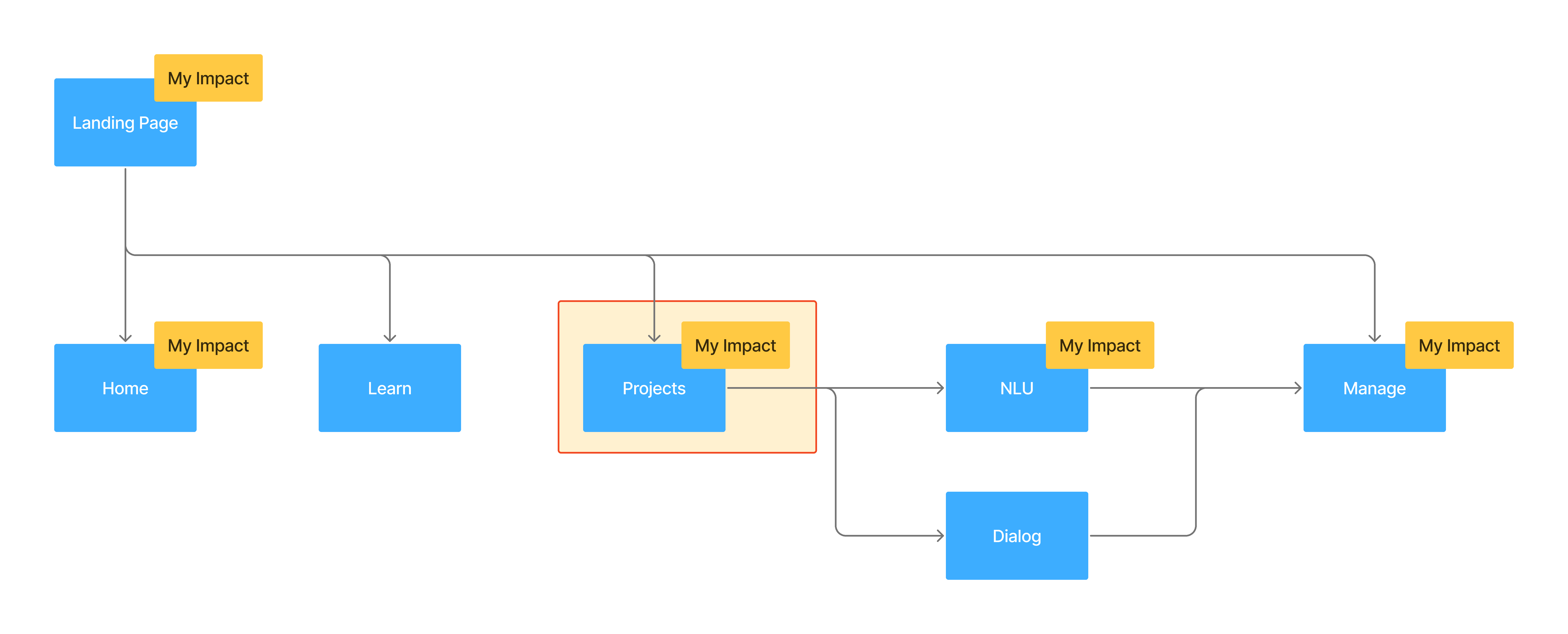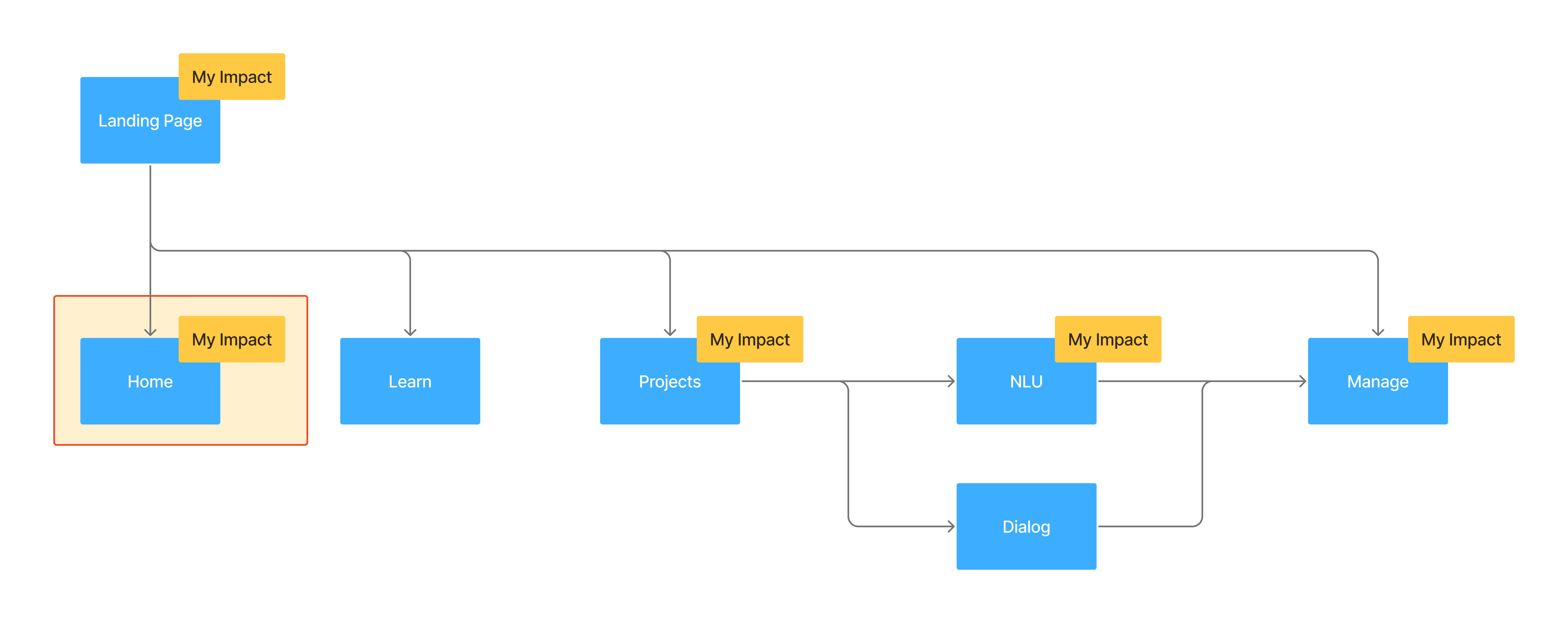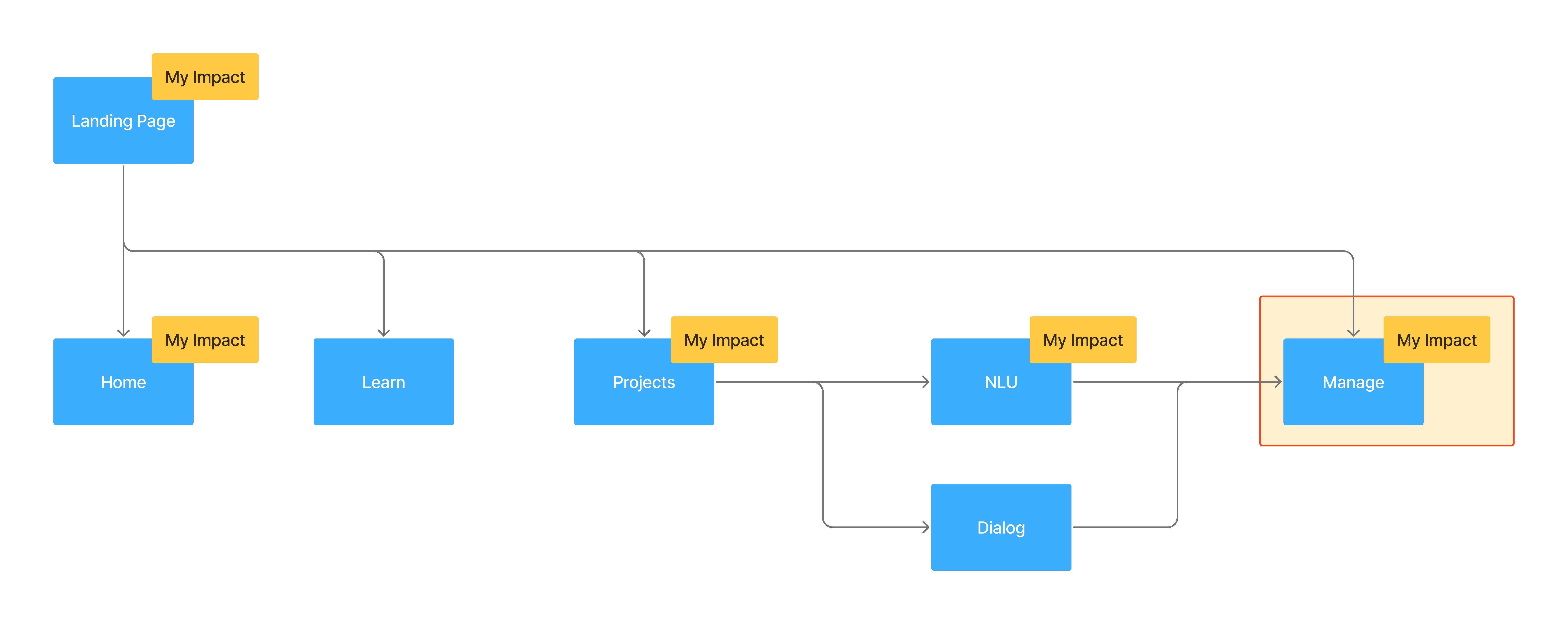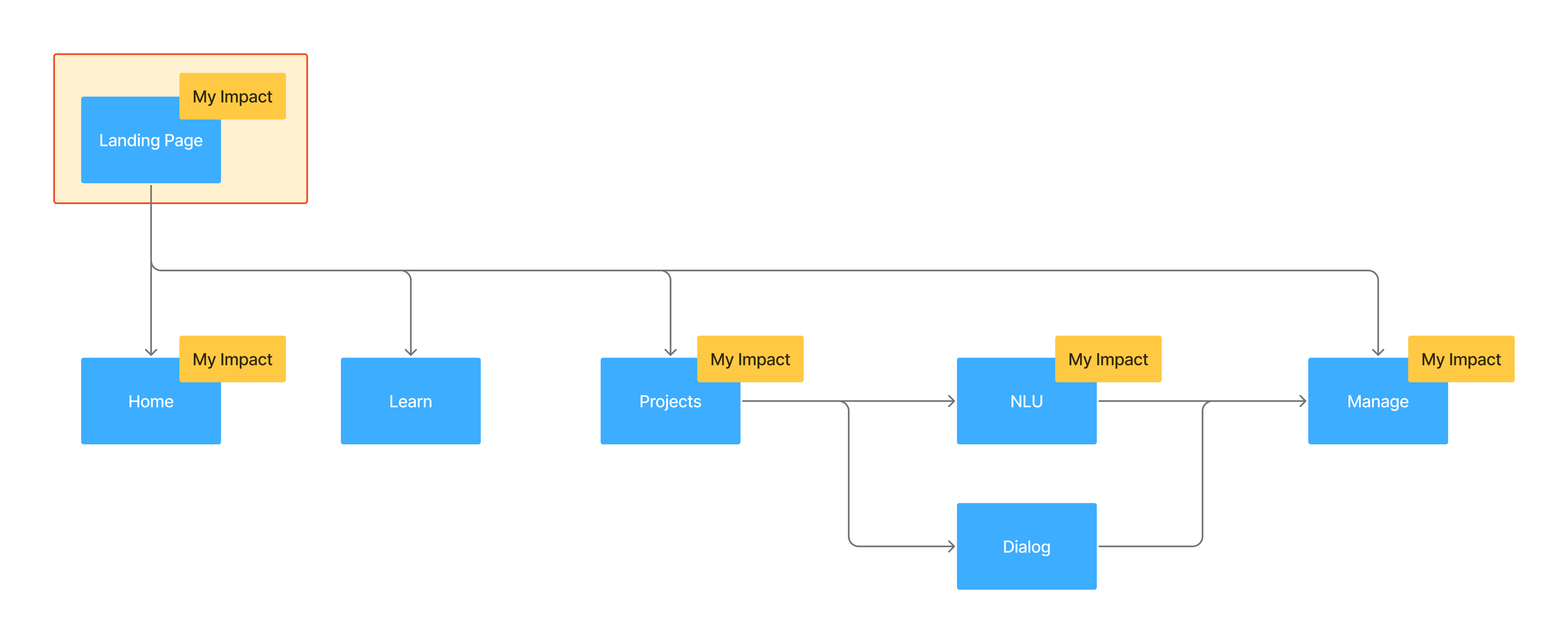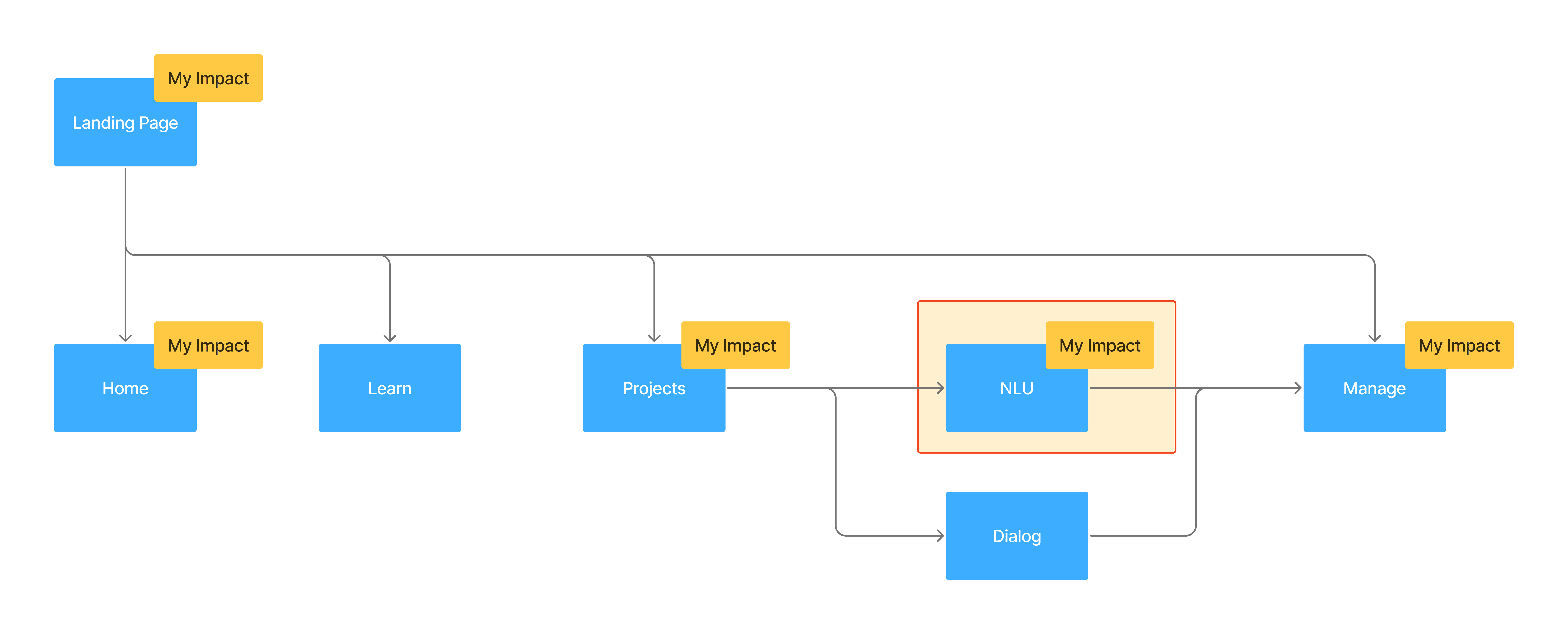 This information architecture illustrates my impact across the Nuance Mix platform. My contributions spanned the end-to-end experience — from entry points like the Landing Page, which drove signup and adoption, through the full in-tool experience: Home, project creation, optimization in NLU, and Dialog, to deployment and management in the Dashboard Manage tab. By influencing these key areas, I helped shape Mix into a cohesive, scalable platform that could grow with enterprise adoption.