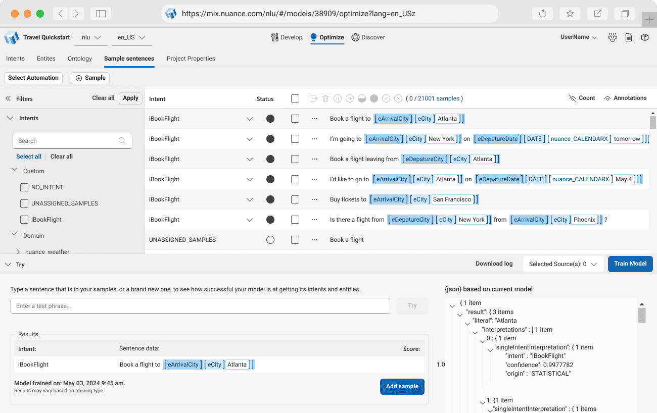 NLU had to serve two distinct user groups. Beginners needed intuitive workflows in Develop to create intents, entities, and sample sentences without being overwhelmed. Experts required more advanced capabilities in Optimize to refine models, apply AI automation, and analyze performance across larger datasets.