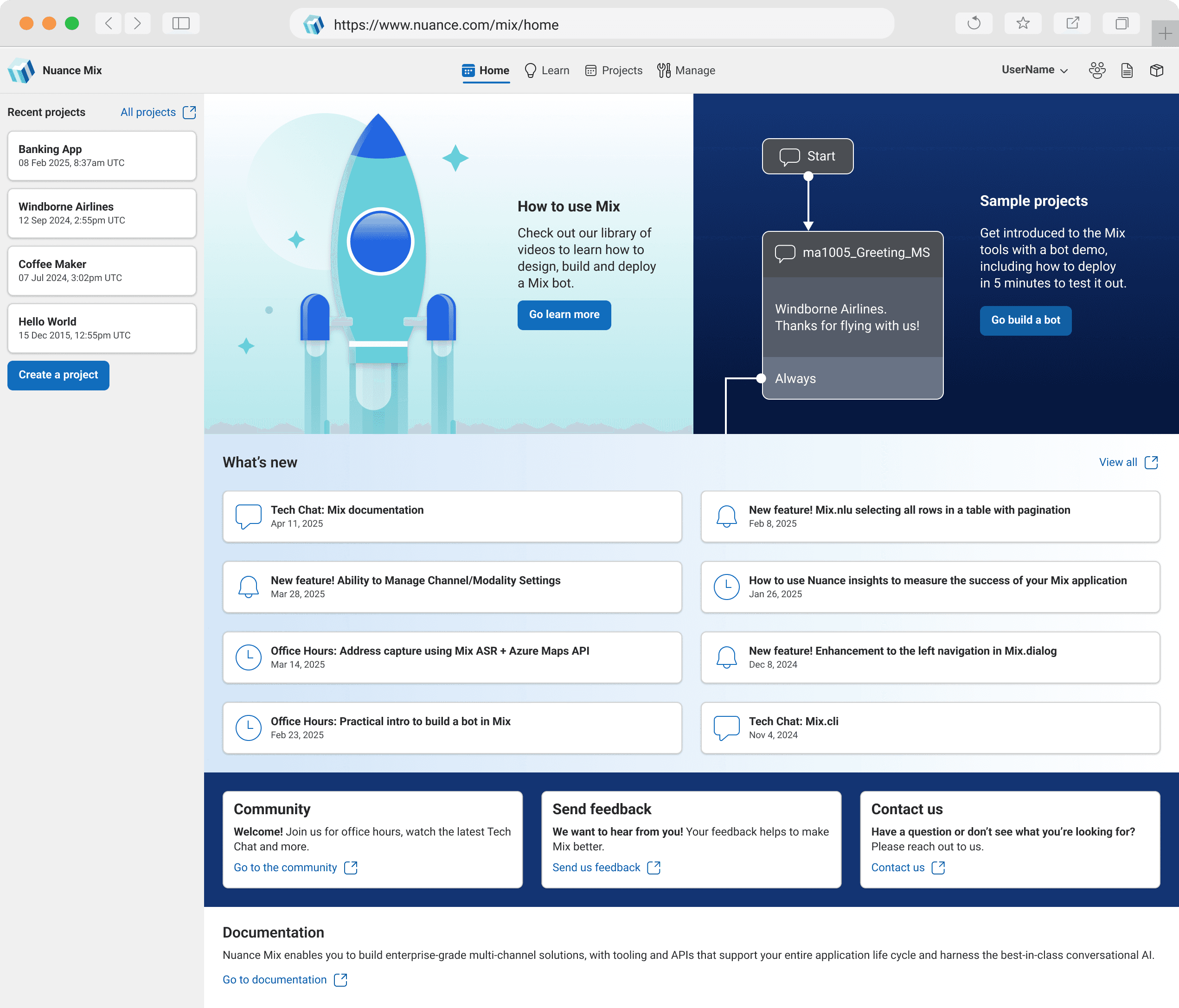 As Mix expanded, users needed more than just access to NLU and Dialog. Without a dedicated Home page, they lacked a clear place to discover education, sample projects, documentation, feature updates, and community engagement.