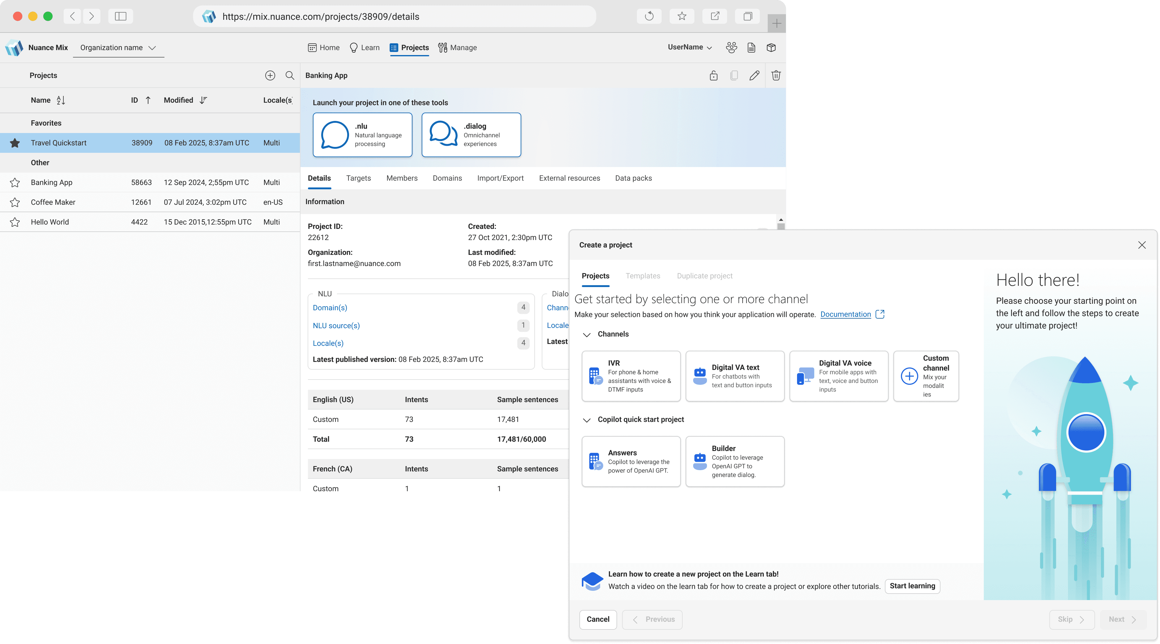 A single place to create and manage projects holistically. Users needed a consistent way to launch NLU and Dialog, view project metadata, and add features such as multi-language, team members, domains, or importing/exporting resources.