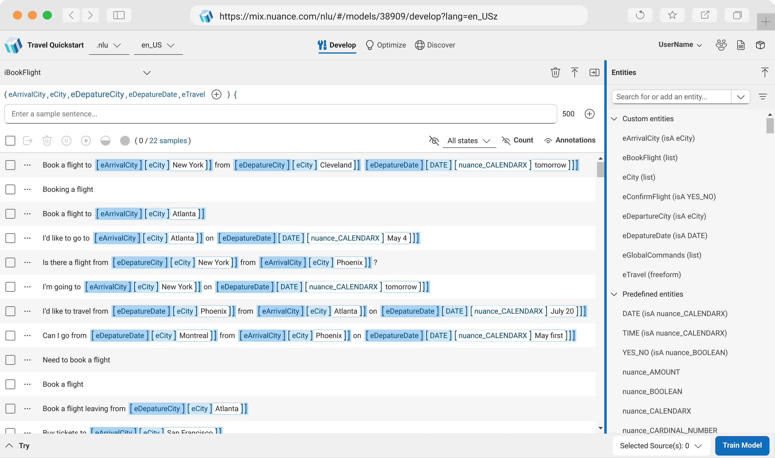 Develop tab (beginner workflows for intents, entities, and sample sentences)