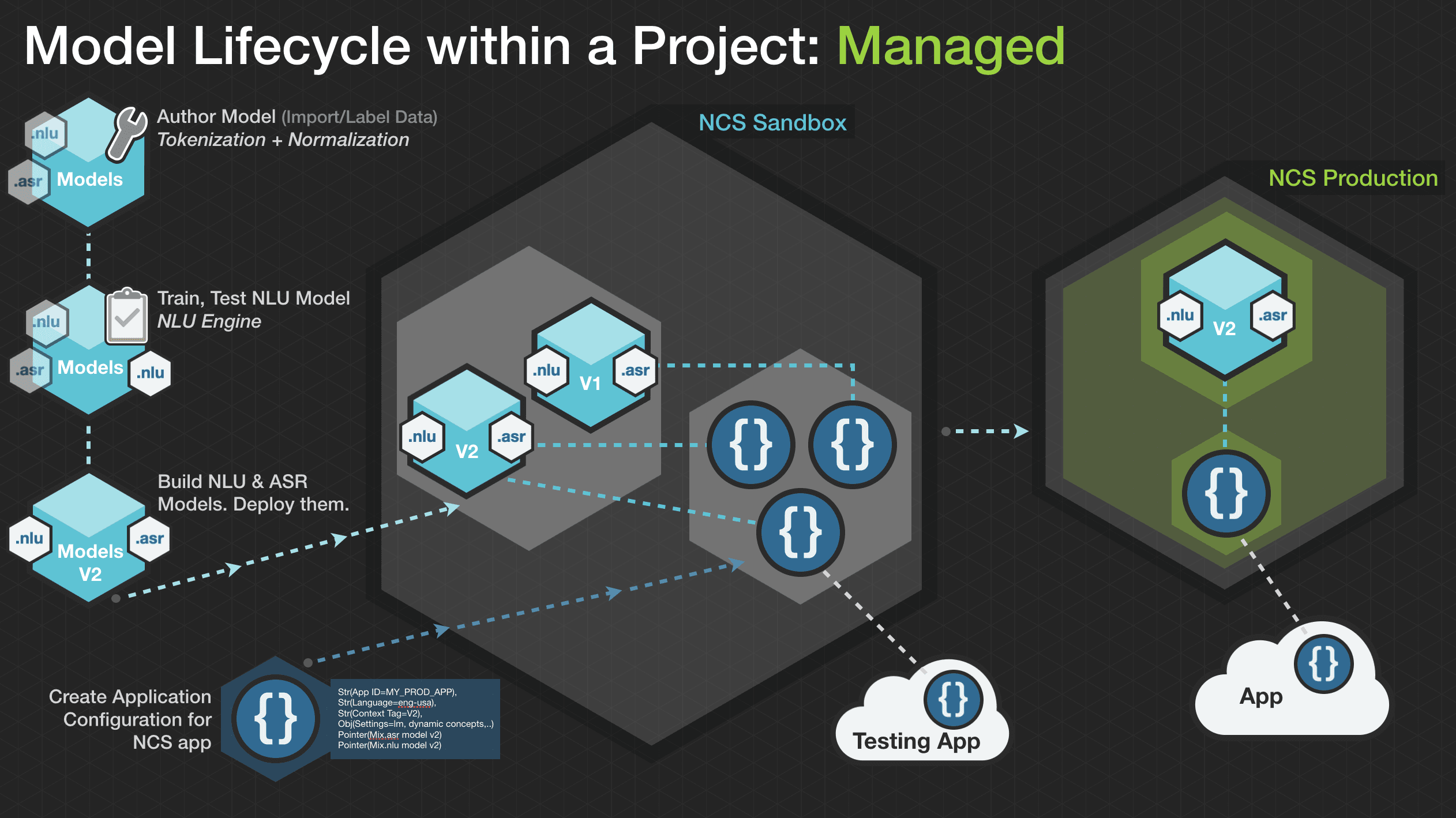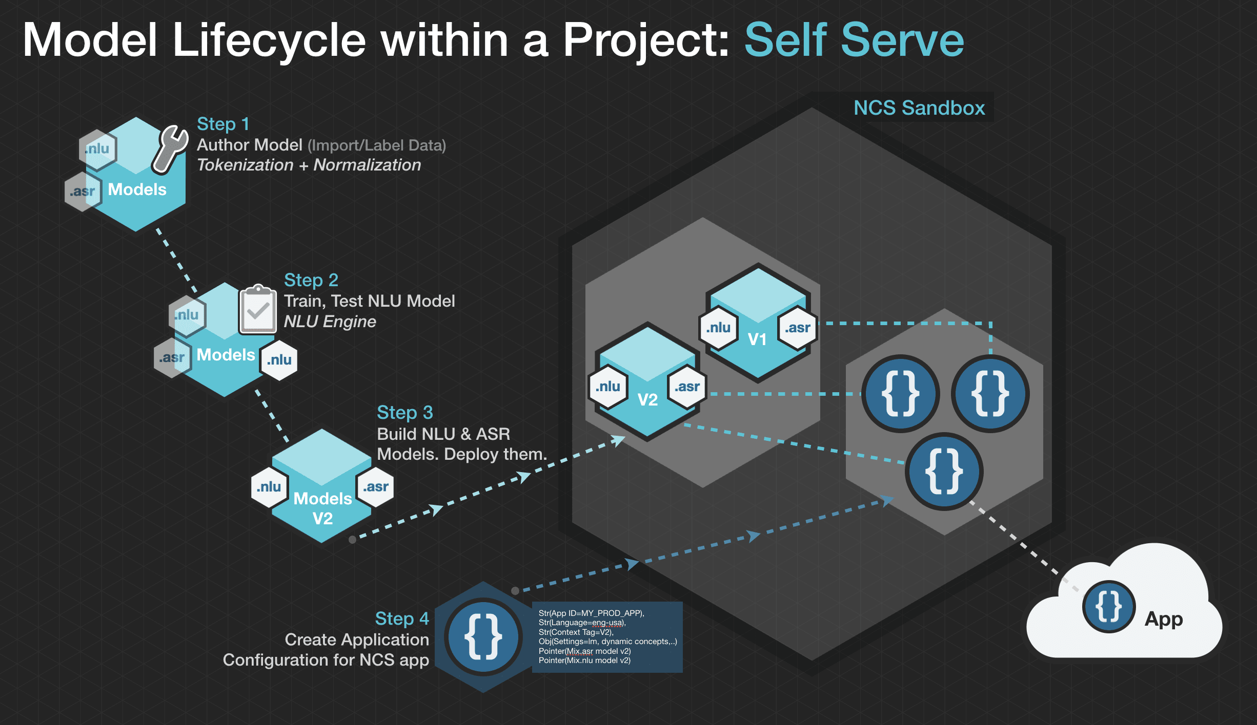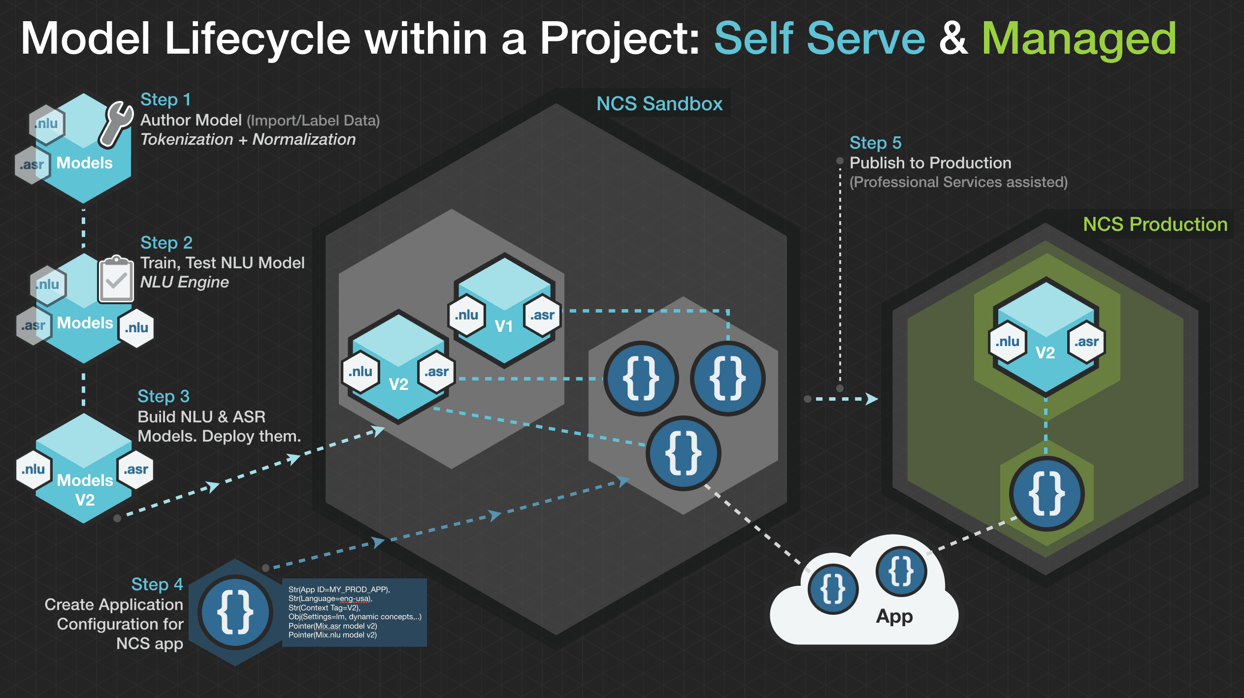 This diagram outlines the five-step lifecycle of ASR and NLU models within a Mix project—from authoring and testing in the NCS Sandbox to deploying and publishing production-ready configurations with professional services support.