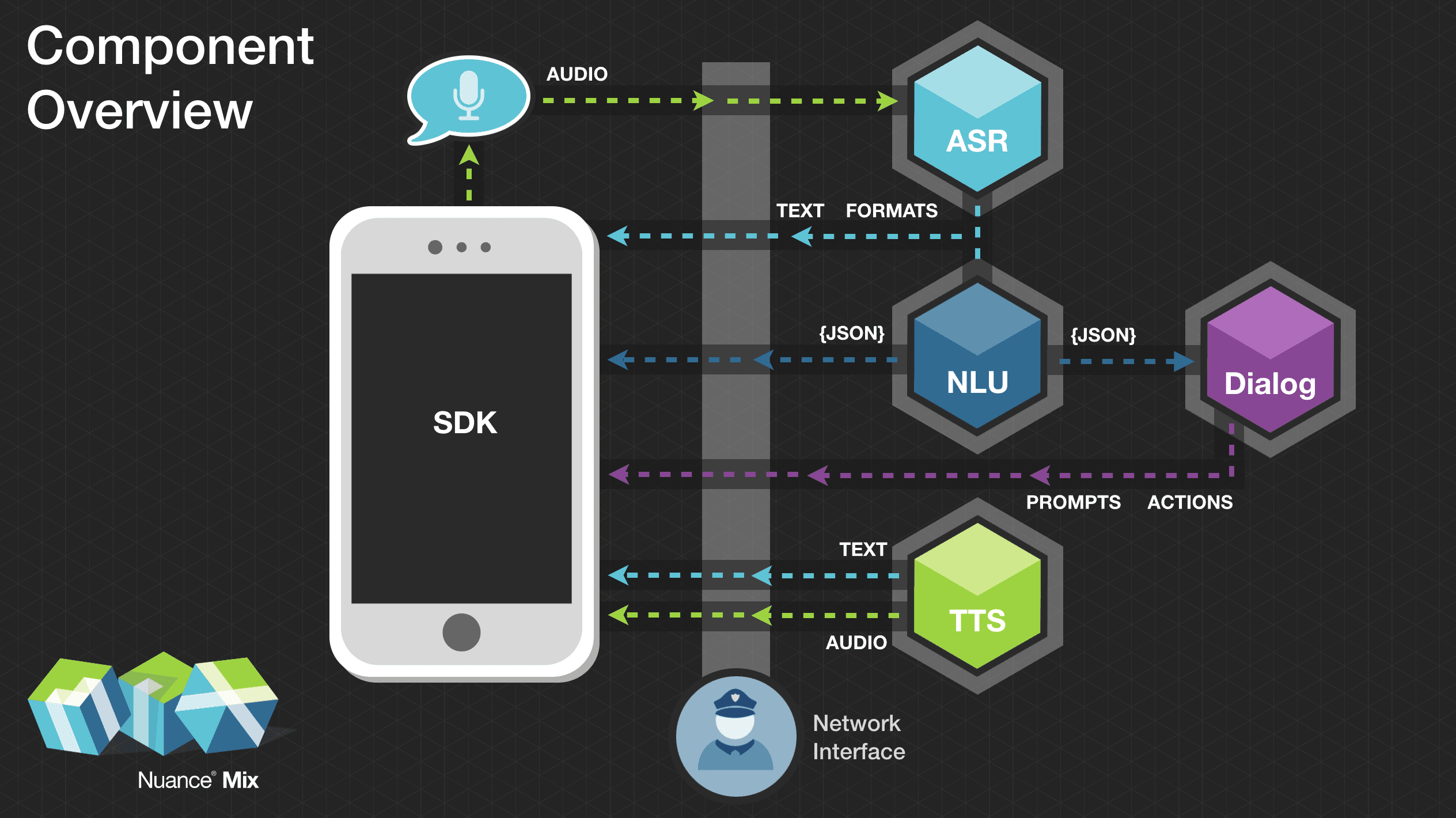 This component-level marketecture illustrates how Mix SDK connects with ASR, NLU, Dialog, and TTS services to power real-time, end-to-end conversational AI—designed to clearly show data flow, service relationships, and integration pathways.