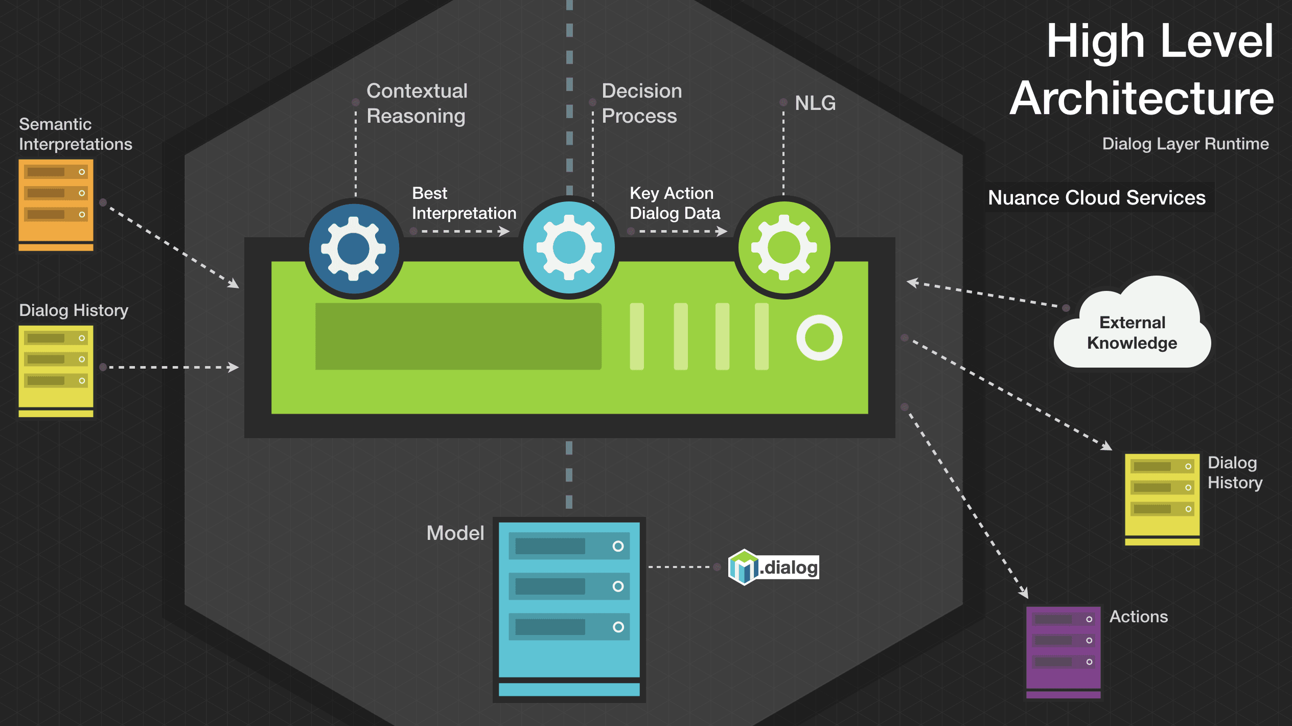 This diagram breaks down the dialog layer runtime, showing how contextual reasoning, dialog history, semantic interpretations, and external knowledge come together to drive decision-making and natural language generation in real time.