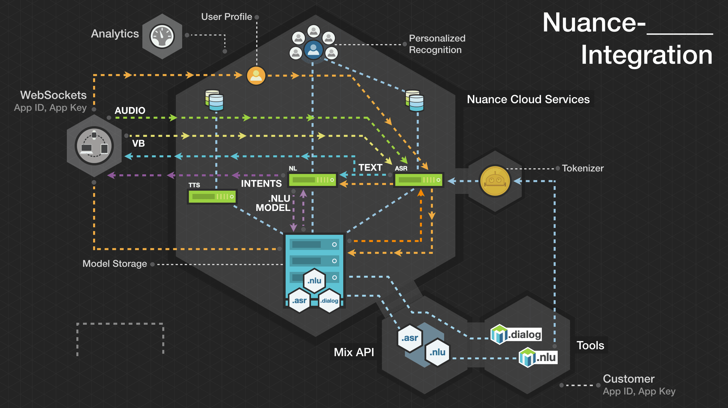 This integration diagram showcases how Nuance Cloud Services—including ASR, NLU, and dialog tools—can be securely embedded into third-party platforms like Sony via APIs, WebSockets, and model storage, enabling personalized, end-to-end conversational AI experiences.