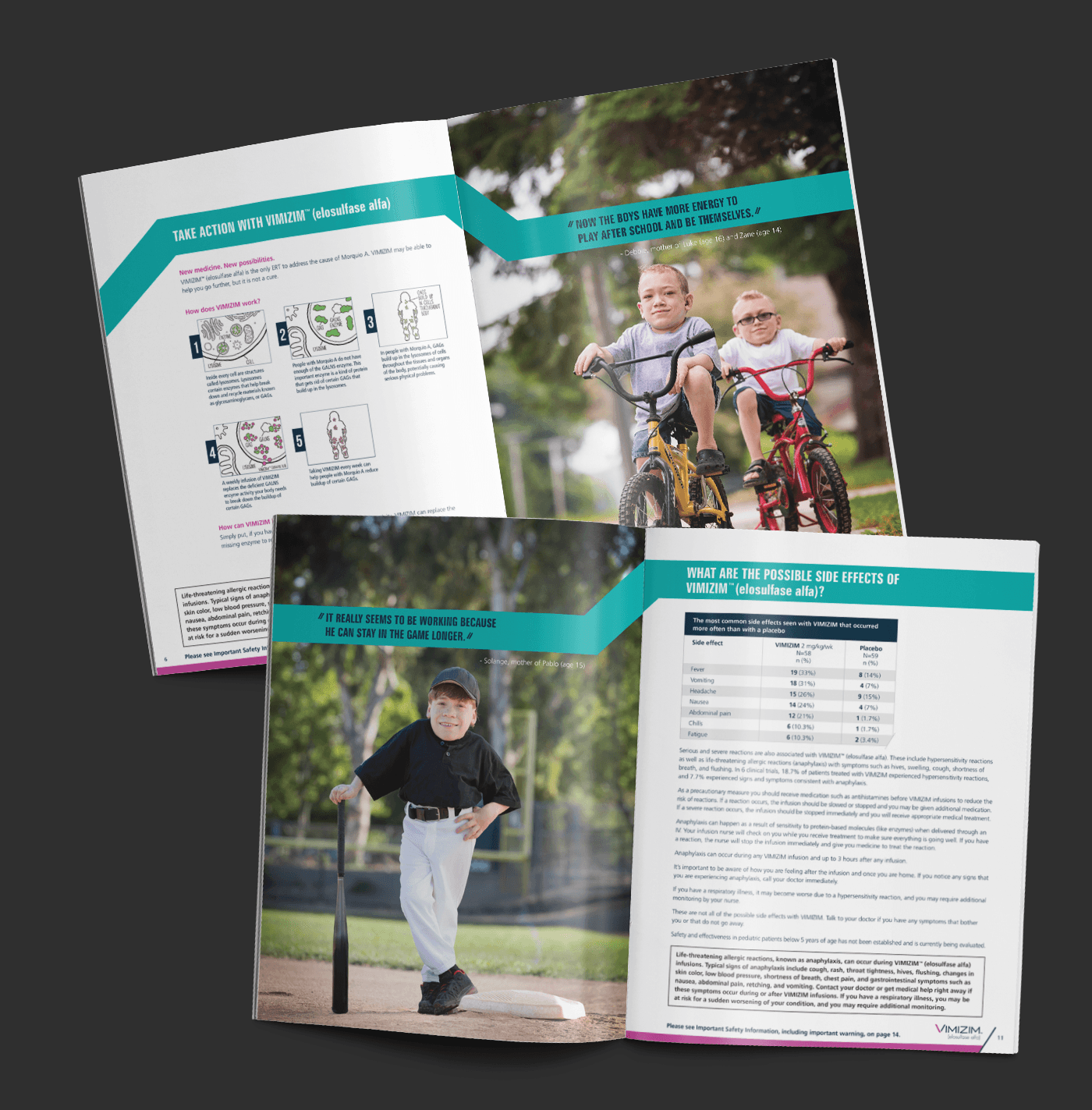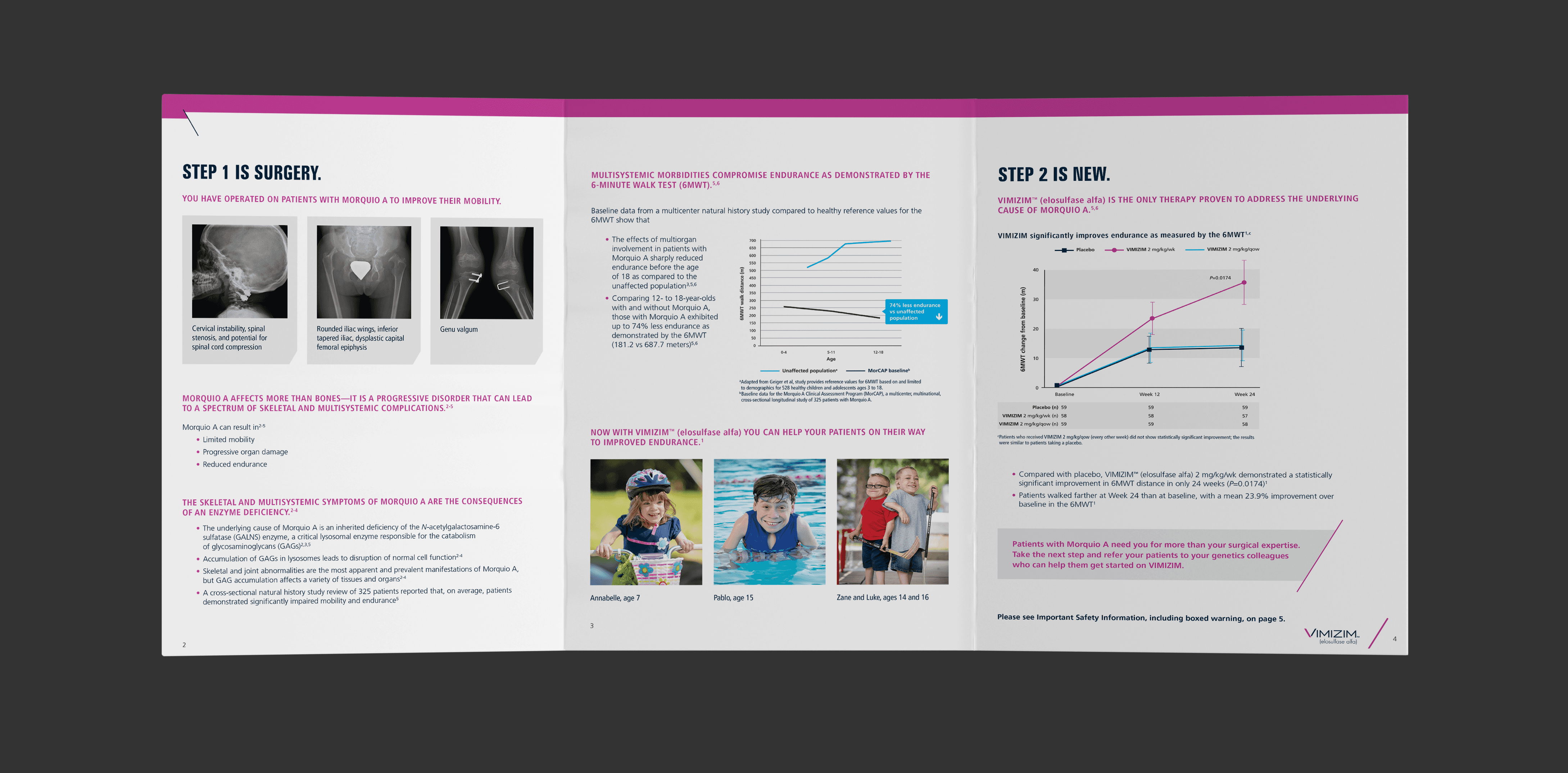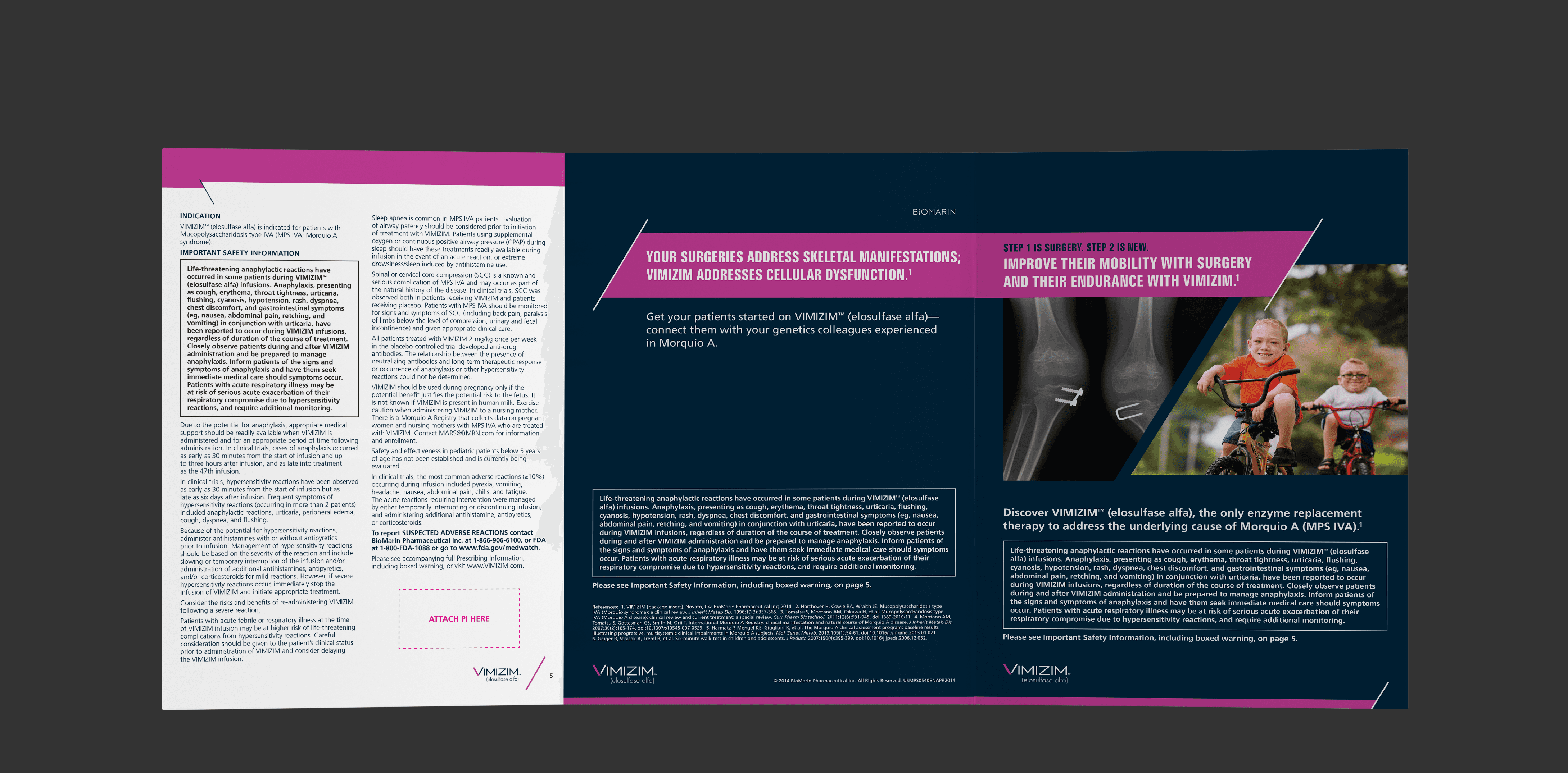 Art directed brand, identity, and campaign materials to support the launch of VIMIZIM™ (elosulfase alfa), an enzyme replacement therapy for patients with Morquio A syndrome. This work was part of a U.S. and global initiative to educate both patients and physicians, while introducing BioMarin’s first-ever treatment for this rare disease.